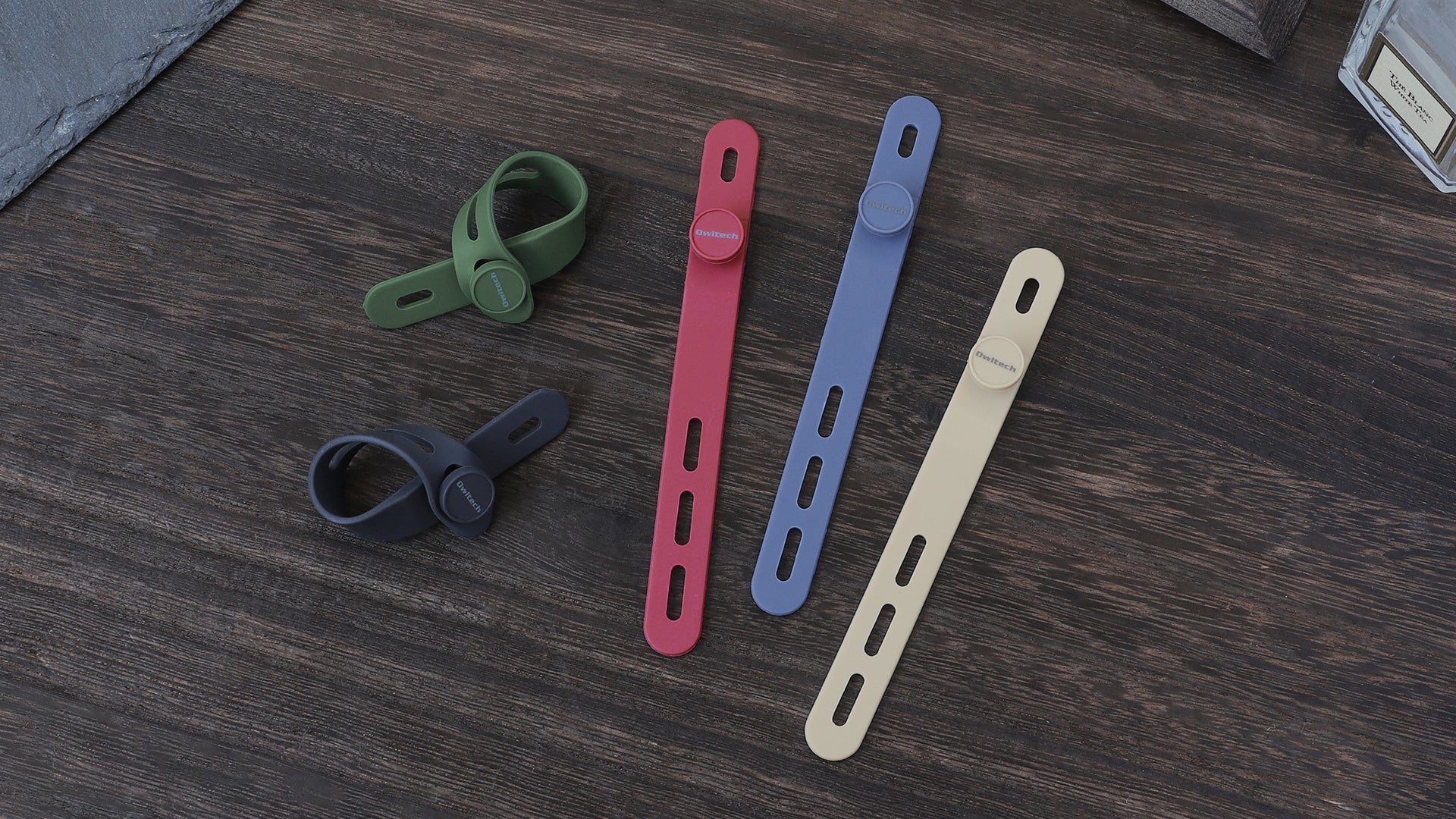 シリコン素材を採用しているので、しっとりと手に馴染む肌触りと、様々な太さや長さのケーブルもまとめられる伸縮性が特長です。摩擦や引っ張りに強く、汚れたら丸洗いができるため繰り返しのご使用も可能です。一般的な面ファスナー製やマジックテープ製のように、バンド同士がくっついたり、ゴミが絡みつくこともありません。また、穴にボタンを引っ掛けて留めるので、バンドをほどいても紛失する心配がありません。