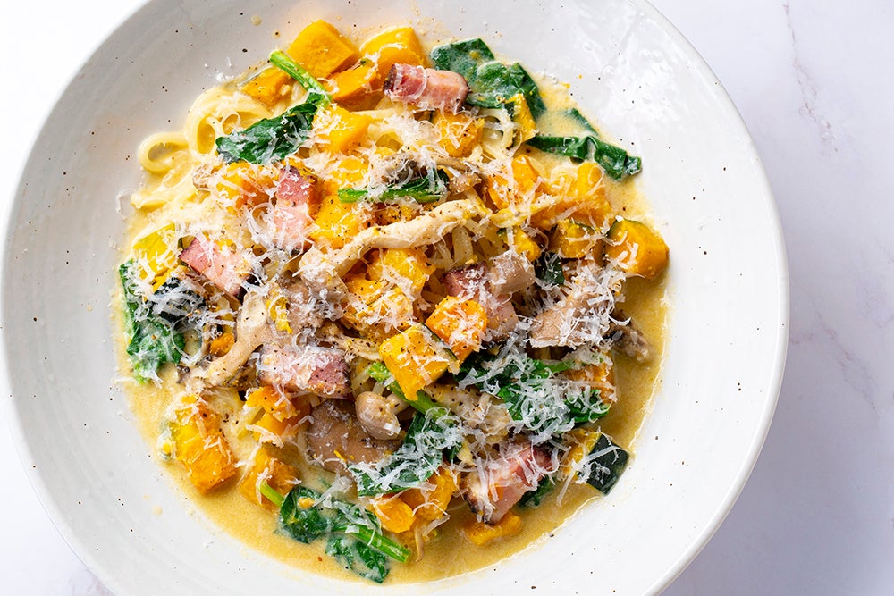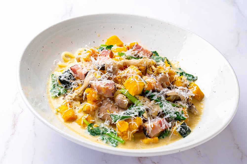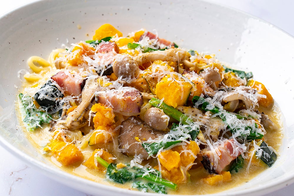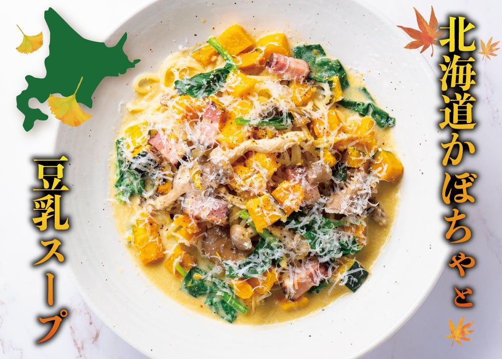 カラダ喜ぶ期間限定生パスタ登場!『北海道生パスタ専門店 麦と卵』からホクホクな北海道産かぼちゃと、農家のベーコンやきのこがたっぷり!塩麹でまろやかなコクのある塩気をプラスした豆乳スープスパゲティを販売
