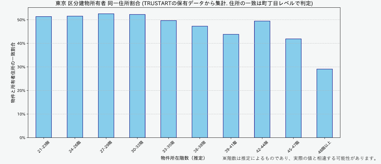 また、東京都内の21階以上の区分建物を階数別に集計したところ、高層階になるほど法人所有割合が高まる傾向(48階以上で約30%)が確認されました。この傾向は、神戸市が2025年2月に発表した報告書※とも一致しています。同資料では、神戸市内のタワーマンションについて、地区の内外を問わず20階以上の階層では法人所有や所有者本人が住民票を置いていない割合が増える同様の傾向が示されています。