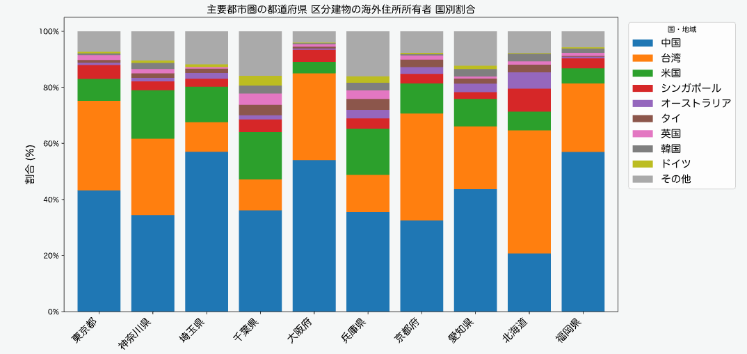 全都道府県で中国・台湾が上位を占める構造は共通していますが、地域によって構成比は異なります。北海道・京都府では台湾が最多となっており、特に北海道では台湾が中国を大きく上回っています。一方、埼玉・福岡では中国が約57%を占めており、神奈川県・千葉県・兵庫県では米国の比率が相対的に高くなっています。