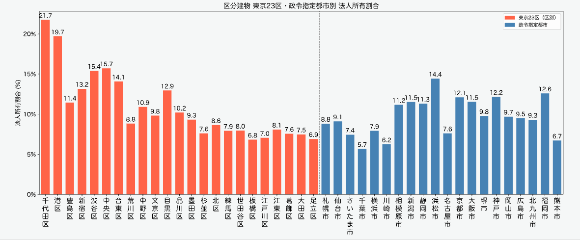 法人所有割合は国外住所所有者と比較して地域間の差が小さく、全国的に一定程度存在しています。都道府県別では京都府・兵庫県・福岡県が上位を占め、東京23区では千代田区・港区など都心部で高くなっています。