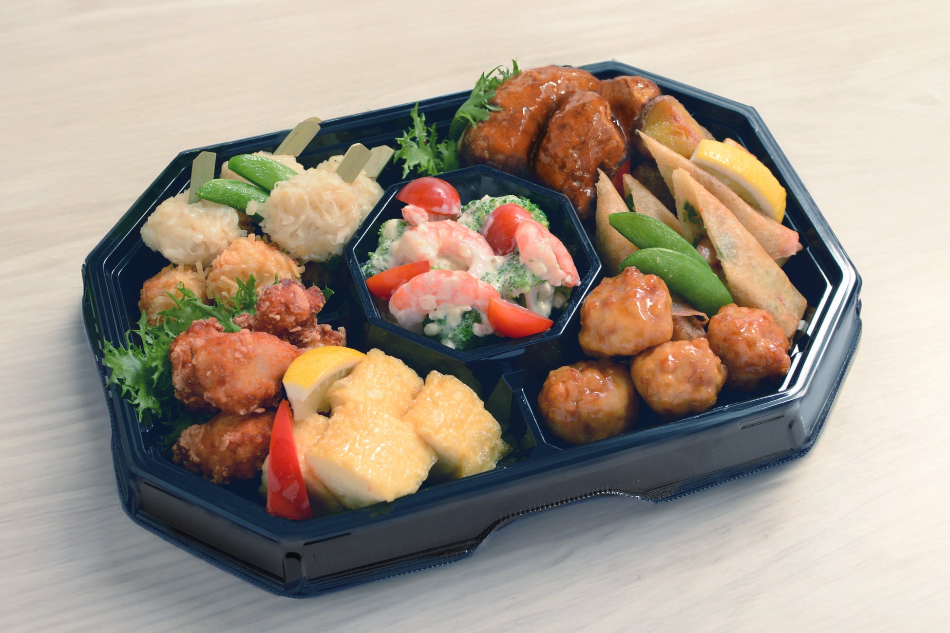 豆腐鶏つくねの黒酢あんかけや梅の花人気の豆腐しゅうまいと湯葉揚げ、生麩田楽、さっぱり爽やかな湯葉と胡瓜の酢の物など色々なお惣菜が楽しめる期間限定のオードブルです。