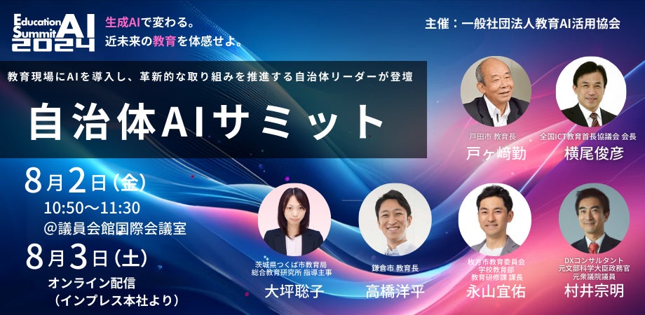 一般社団法人教育AI活用協会(代表理事・佐藤雄太)は、8月2日に議員会館国際会議室、多目的ホール、3日に株式会社インプレスからの配信にて「教育AIサミット2024」を開催いたします。