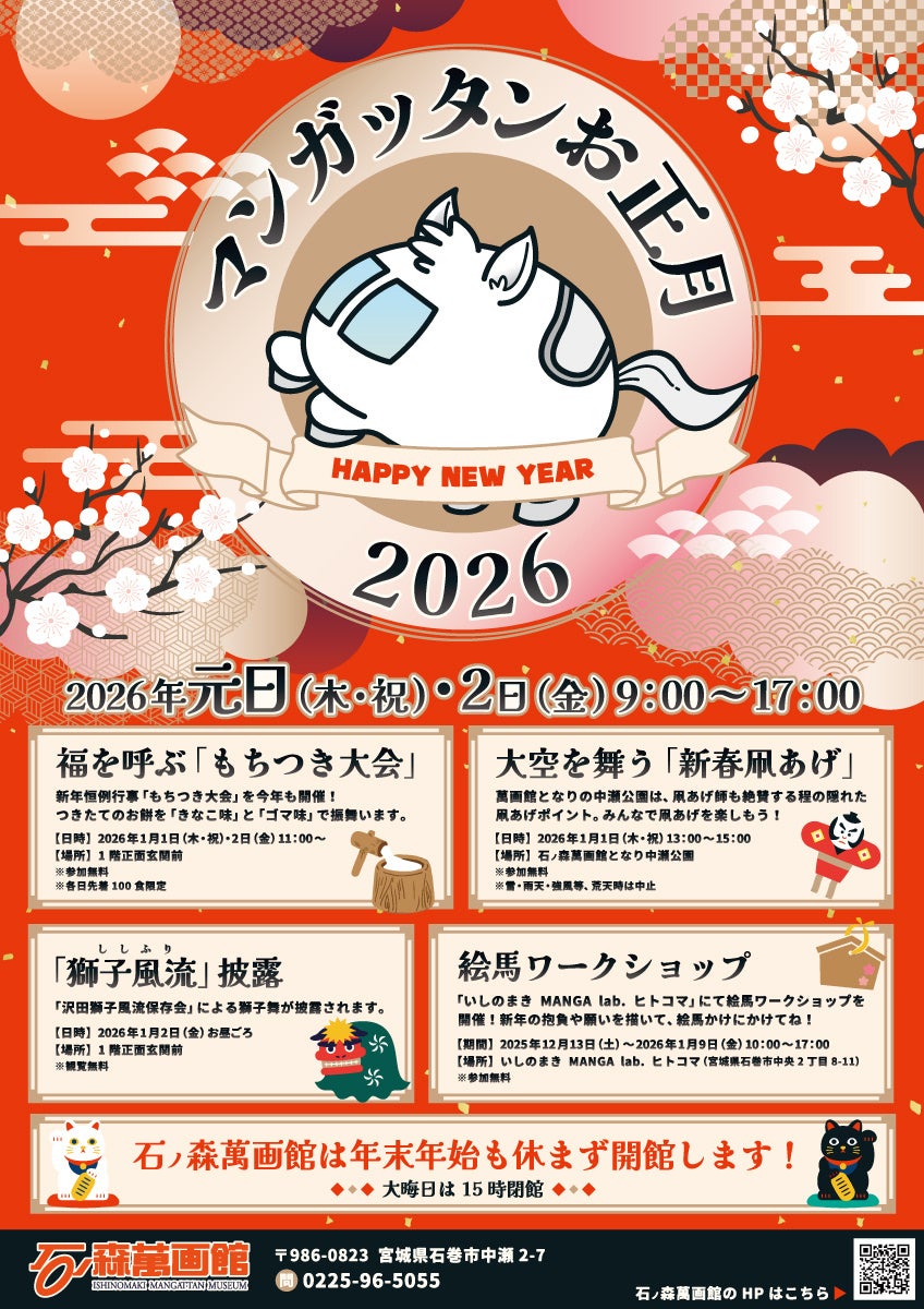 大晦日、12月31日(水)は15時閉館となります。あらかじめご了承ください。そして、毎年恒例となっている正月イベントも下記の通り元日より開催いたしますので、年末年始も是非石ノ森萬画館にご来館ください!!