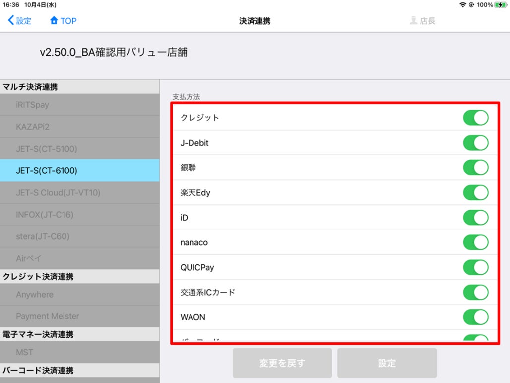 POS側で表示する決済種別ボタンのON・OFF設定が可能です(決済種別の利用可否については端末側ご契約状況によって変わります)。