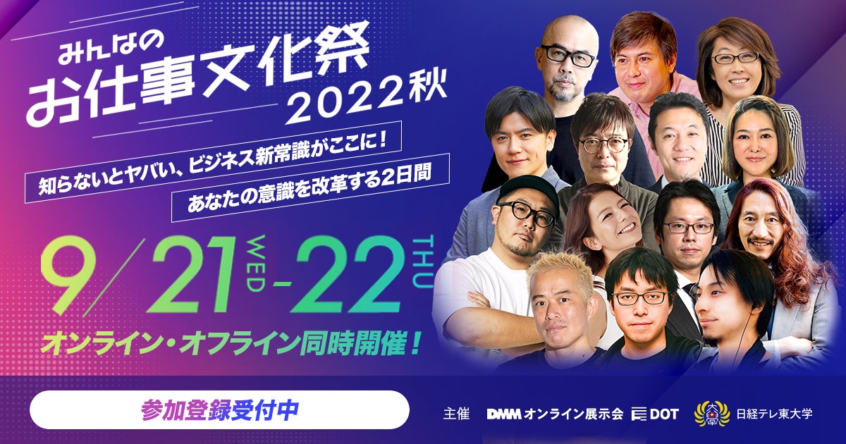 合同会社DMM.com(東京都港区、会長 兼 CEO 亀山敬司 以下、「DMM」)と経済・ビジネスを楽しく学べるYouTubeチャンネル『日経テレ東大学』が主催する『みんなのお仕事文化祭 2022秋』(開催日2022年9月21日・22日)は、本日よりオンライン・オフライン(先行受付)の参加登録をスタートいたしました。