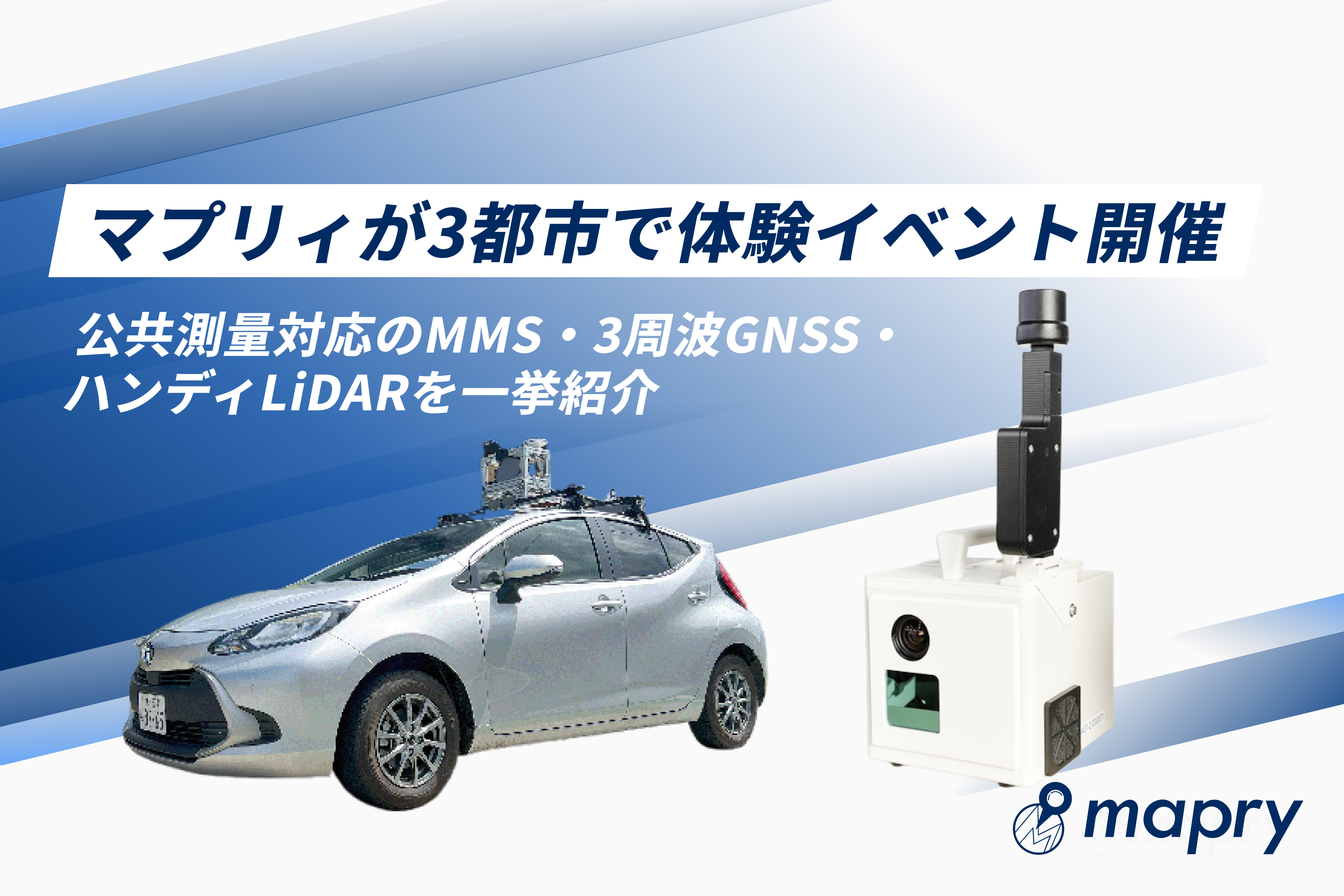 株式会社マプリィ(本社:兵庫県丹波市、代表取締役:山口圭司)は、モービルマッピングシステム 「mapryM2」 を中心に、3周波対応GNSSレシーバー 「R2」 とハンディLiDAR 「LA01-2」 の活用勉強会を含む体験型イベントを、東京・名古屋・大阪の3都市で開催いたします。
