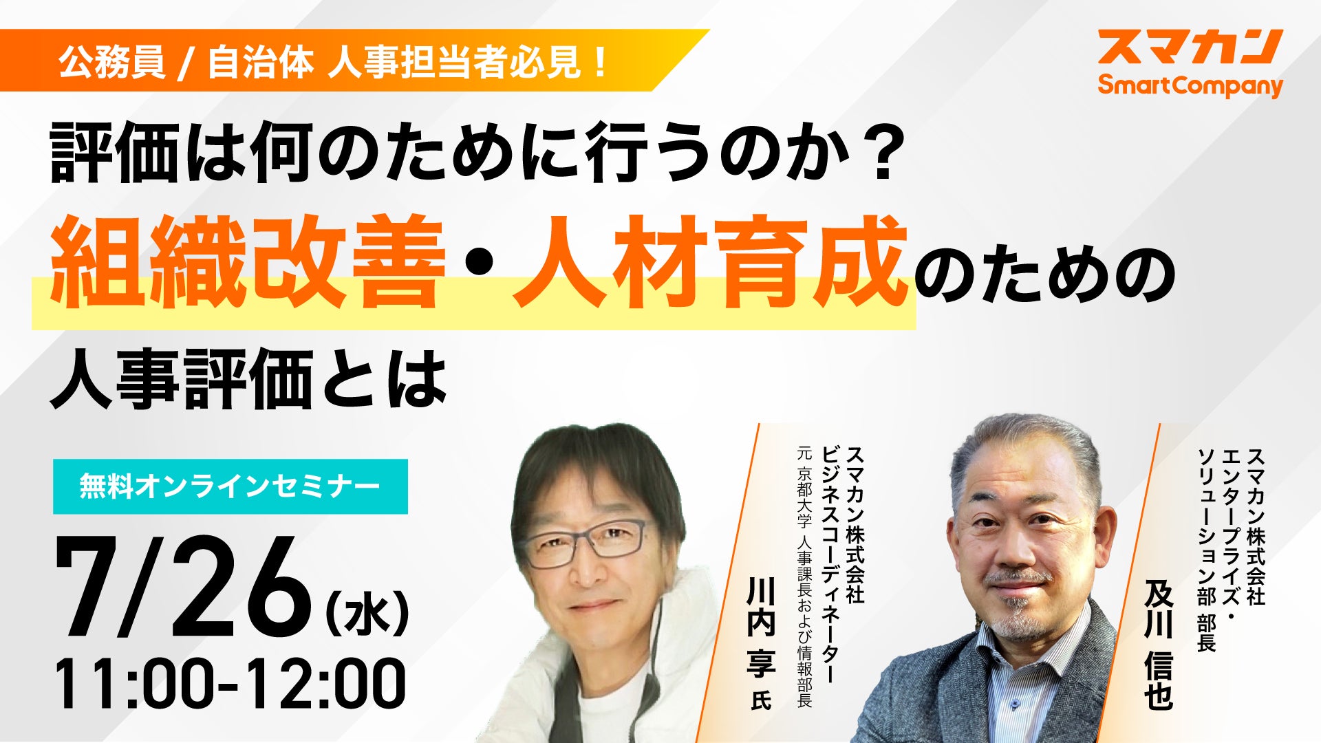 本Webセミナーでは、京都大学で人事課長および情報部長を務め、人材育成を主眼とする人事・評価制度の改革や大学情報環境体制の改革を実現した川内享氏が、具体的な事例を交えながら以下3点を解説いたします。また、長年にわたり人事システム開発や製品開発責任者を務めてきたスマカンの及川信也がファシリテーターとして対談形式でお送りいたします。