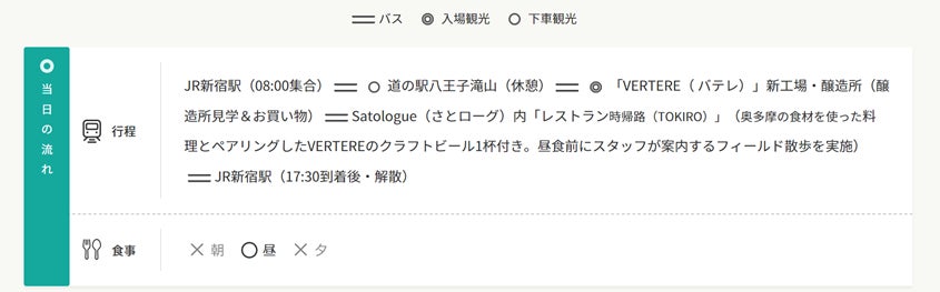 株式会社JR東日本びゅうツーリズム&セールス(本社:東京都墨田区)と株式会社ジェイアール東日本都市開発(本社:東京都渋谷区)、VERTERE(バテレ)合同会社(本社:東京都西多摩郡、以下VERTERE)は、奥多摩エリアの地域活性化と魅力発信を目的とした特別なバスツアーを発売しています。VERTEREの醸造所見学と特別な体験、沿線ガストロノミー「レストラン時帰路(TOKIRO)」での奥多摩の食文化と素材を生かした特別なランチをご提供します。ぜひこの機会にご参加ください。