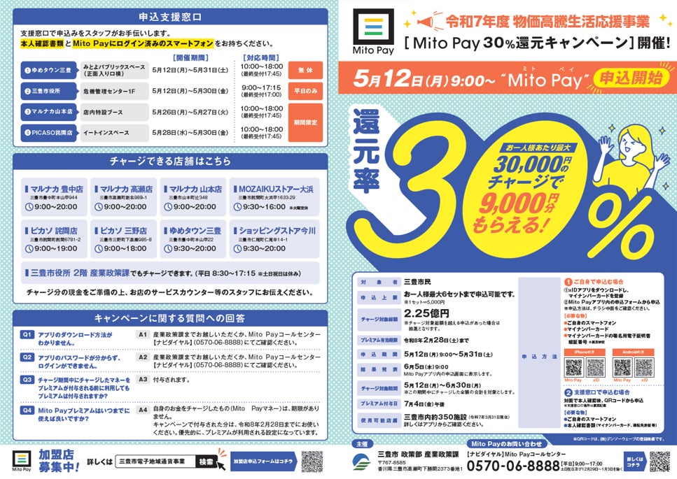この度、香川県三豊市では物価高騰の影響を受けた市民を支援し、地域経済の活性化を図るため、「Mito Pay30%還元キャンペーン」を実施いたします。本キャンペーンは事前申し込み制であり、申込総額が発行上限を超えた場合は抽選となります。