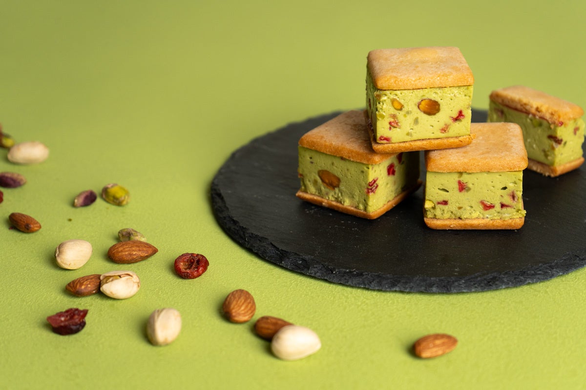ピスタチオを贅沢に使用したカッサータをアーモンドたっぷりのサブレでサンドしました。