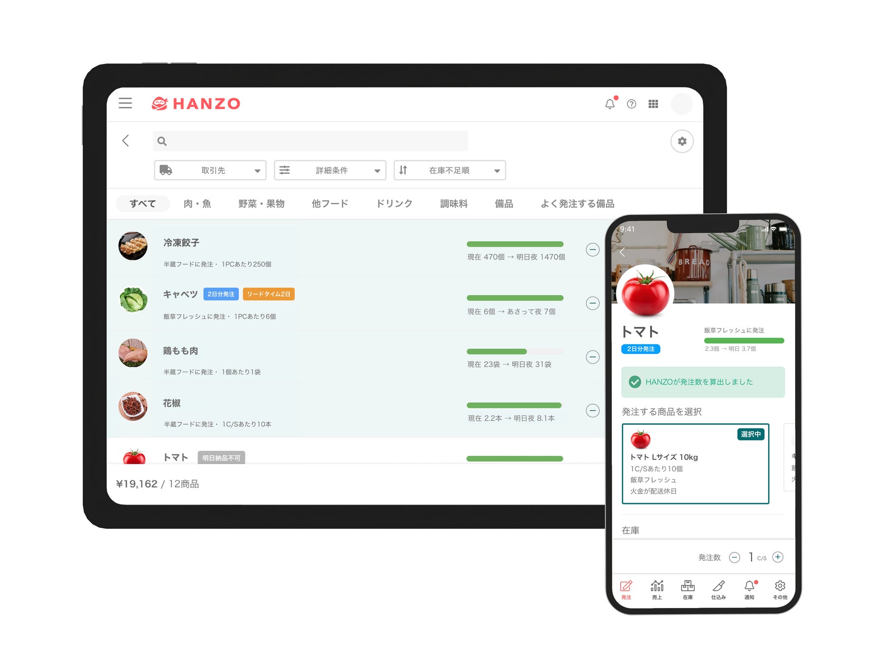 「HANZO 自動発注」は天候に左右される売上増減や、直近の注文傾向なども加味した売上予測を店舗ごとにAIが行った上で、適切な食材の発注量を算出し自動で発注システムに連携します。発注時間短縮のほか、発注ミス・精度のばらつきによる食材不足(品切れ)や過剰在庫を防止し、心理的負担や食材ロス軽減に貢献します。