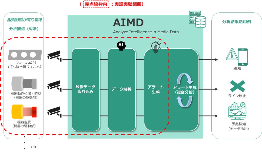ラミネートチューブを製造する相模容器も、これらの観点を重要視しており、品質向上を追求しています。その取組みとして、リアルタイムでの検知とデータ活用(事後でのトレース、根本原因の分析、予兆検知等)を組み合わせたシステムの導入を検討するため、IWIと連携し「AIMD」を用いて工場内の製造ラインにおける実証実験を行いました。