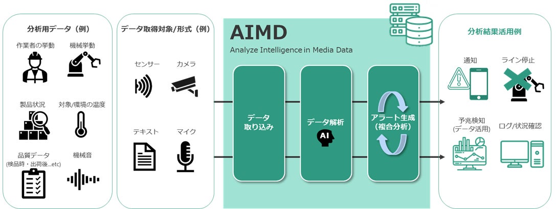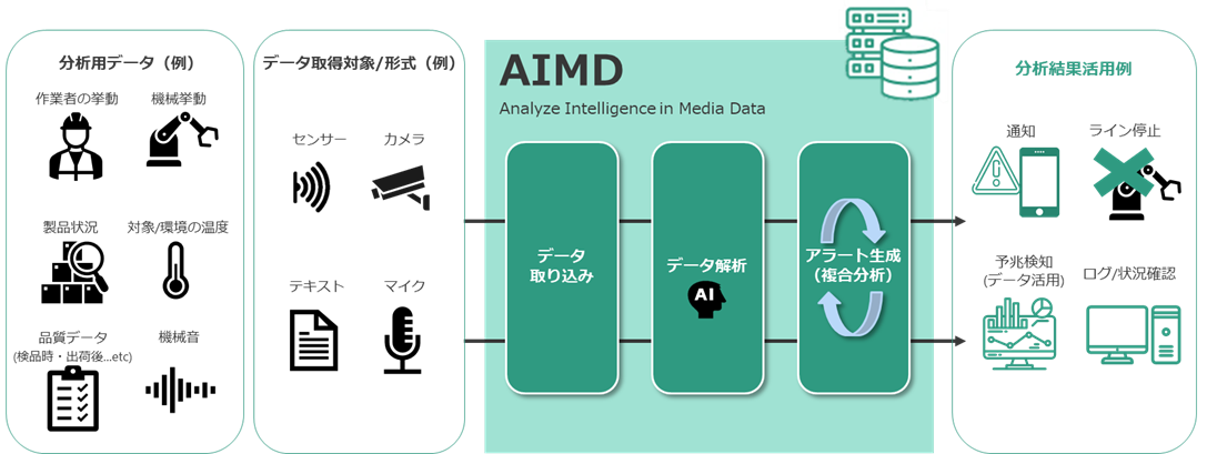 「AIMD」は、インプットとなるデータの種類を問わず、リアルタイムに複合分析することが可能で、要件に合わせてIWIのエンジニアが分析モデルおよびAIエンジンを調整し提供します。また、製造業では、同一の分析を複数箇所、複数の生産ラインで行う場合でも、システム/サーバを乱立させることなく効率的に集約することも実現可能です。