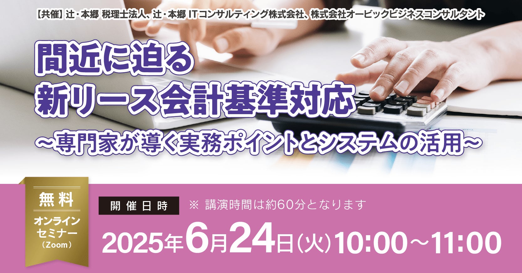 辻・本郷 税理士法人(本社:東京都新宿区、理事長:桑木小恵子)と、株式会社オービックビジネスコンサルタント(本社:東京都新宿区、代表取締役社長:和田成史)と共催で、2025年6月24日(火)より「間近に迫る新リース会計基準対応~専門家が導く実務ポイントとシステムの活用~」セミナーを開催いたします。