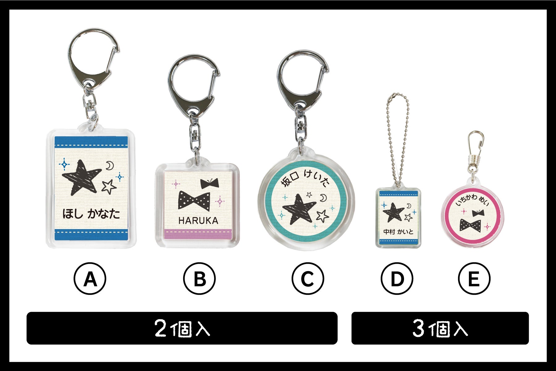 1つずつ入れるお名前を変えることができます。ひらがなとローマ字にしたり、ご兄弟で分けたりできます。(デザインは共通)