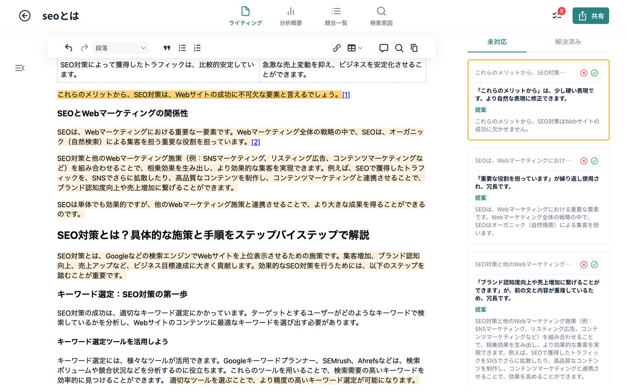 誤字脱字や重複表現などの基本的なエラーはもちろん、読みにくい文構造や意味がわかりにくい箇所にも着目し、改善提案を行うため、記事品質の均一化と向上が期待できます。