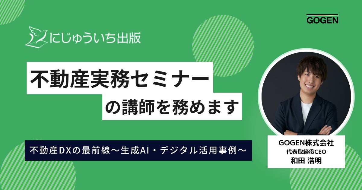 不動産売買支援ハブ「レリーズプラットフォーム」の開発・提供をするGOGEN株式会社(本社:東京都港区) の代表取締役CEO:和田 浩明が、本日9月19日(木)に開催されるにじゅういち出版主催のセミナー「不動産DXの最前線 〜生成AI・デジタル活用事例」の講師を務めます。