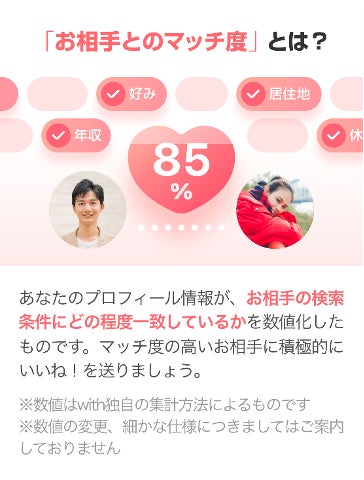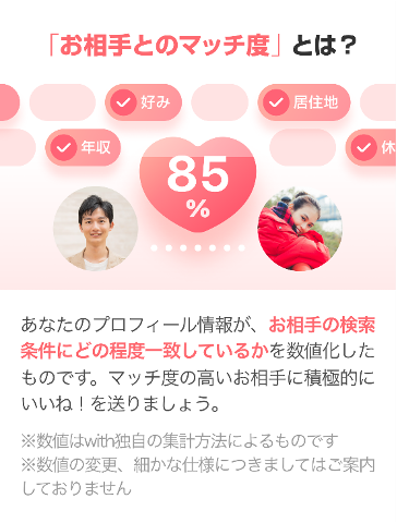①自身のプロフィール情報とお相手の検索条件のマッチ度を「%」数値で表示