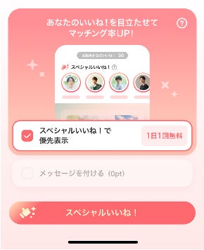 「いいね!」を送る前に、気になるお相手が求める条件に自身がどの程度マッチしているかがわかる!通常の「いいね!」よりも自分をアピールできる機能「スペシャルいいね!」が1日1回無料に