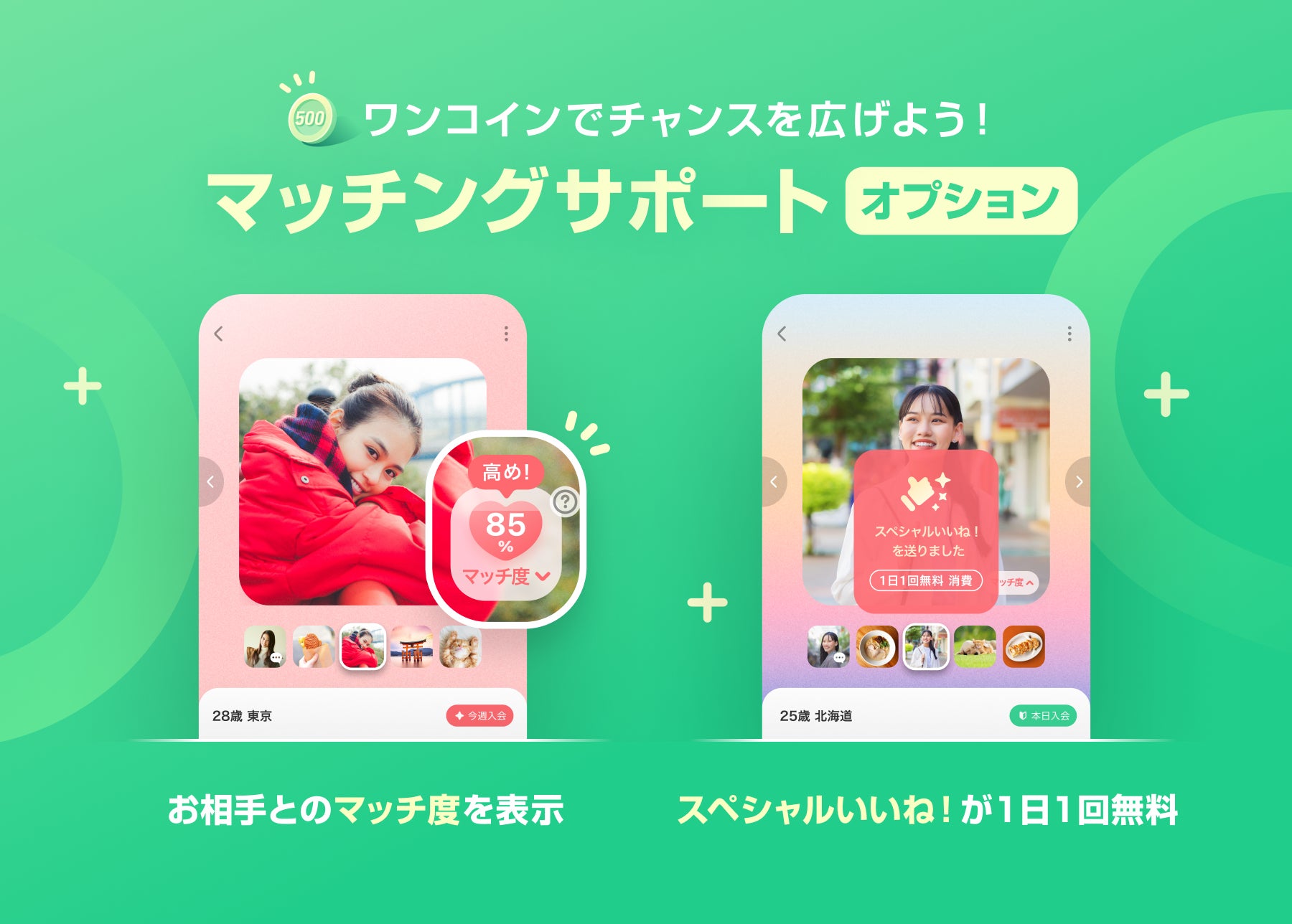 マッチングサポートオプションは「マッチングのチャンスを増やすことをサポートしたい」というコンセプトのもと、2つの限定機能を体験できるものになっております。1つ目の「お相手とのマッチ度」機能は「お相手にどのくらい興味を持たれているか?」が数値化できるようになり、ユーザー様の大きな目的である最適なお相手が見つかる「可能性を広げる」ことができます。2つ目の「スペシャルいいね!1日1回無料」機能は、特別なアプローチである本機能をマッチ度の高いお相手に対して送ることでマッチングする「可能性を高める」ことができます。本オプションはワンコイン価格で利用いただくことができ、たくさんの方の良縁をサポートできればと願い開発しました。ぜひ一度体験していただければ幸いです。