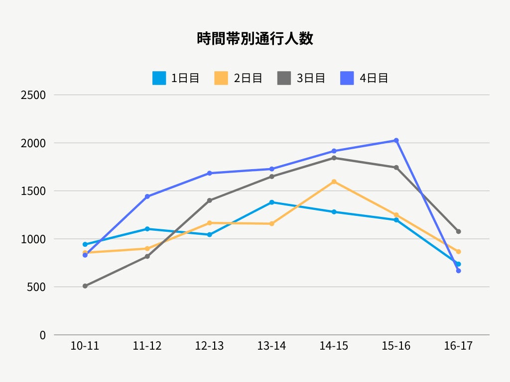 午後来場集中型: どの日も午後にブース前通行量のピークを迎えており、来場者が昼食後や午後の時間を利用して展示会場を回遊する傾向が顕著に表れました。