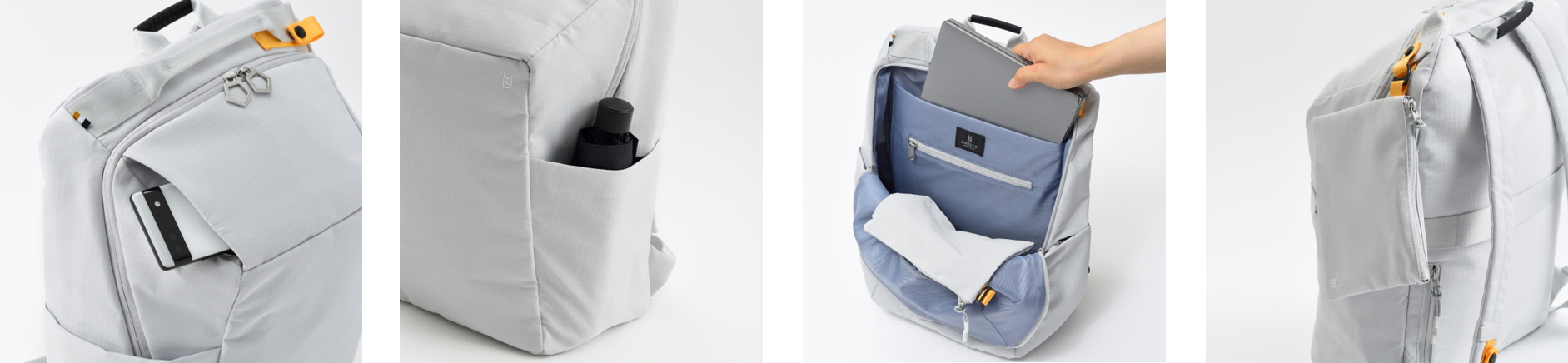 外装前面には、小物の収納に便利な2つのファスナーポケットを配置。両サイドにはペットボトルや折りたたみ傘が収納できるオープンポケット、背面にはすぐに取り出したい小物の収納に便利なファスナーポケットを搭載しています。