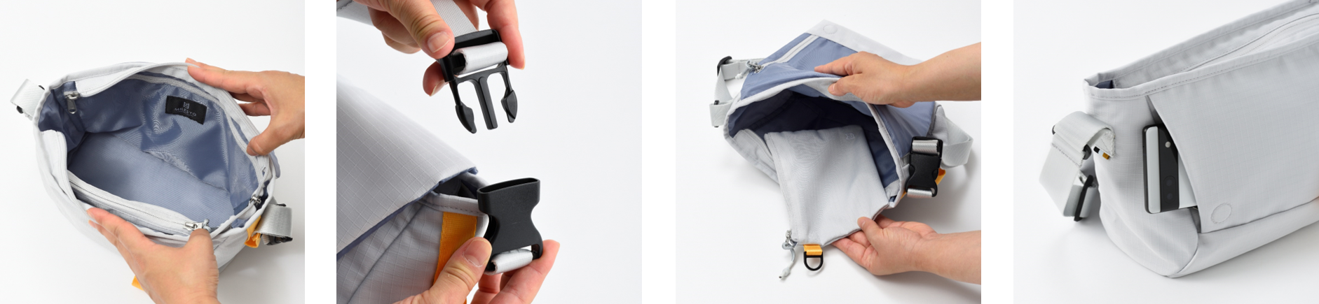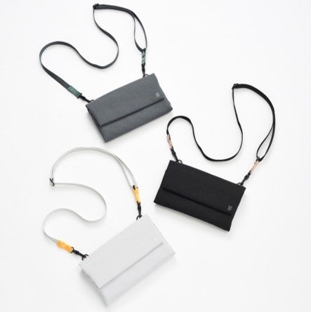 必需品や500mLのペットボトルがすっきり収まるコンパクトなサイズ仕様。ショルダーはワンタッチ式のバックル付きで、着脱がスムーズにできます。内部に着脱式ポーチを装備。取り外したポーチはバッグ本体のサイドに装着が可能です。