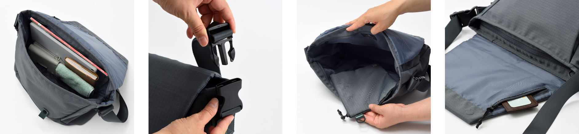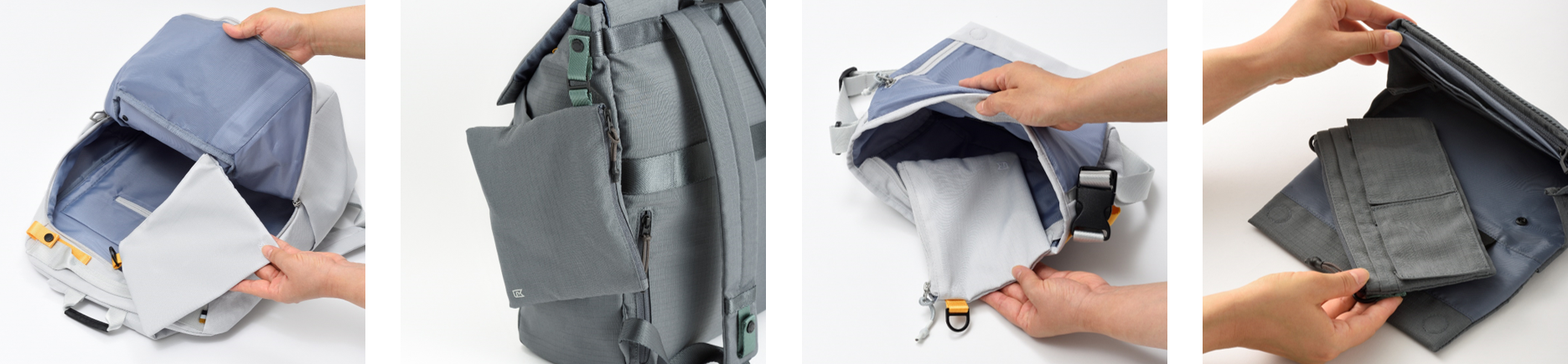 バッグ内部に着脱可能なポーチを装備。バッグ内部に装着しているときは内装ポケットとして、取り外したときは旅先などで使える独立したポーチとして使用が可能です。バックパックとメッセンジャーバッグ、ボストンバッグの取り外したポーチは、バッグ本体のテープ部分に接続して外付けポーチとしても使用可能。