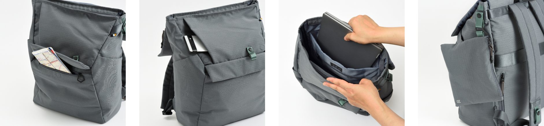 メインコンパートメントには15インチまでのノートPCを収納可能とするスリーブポケットと着脱式ポーチを設置。取り外したポーチはバックパック本体のサイドに装着が可能です。