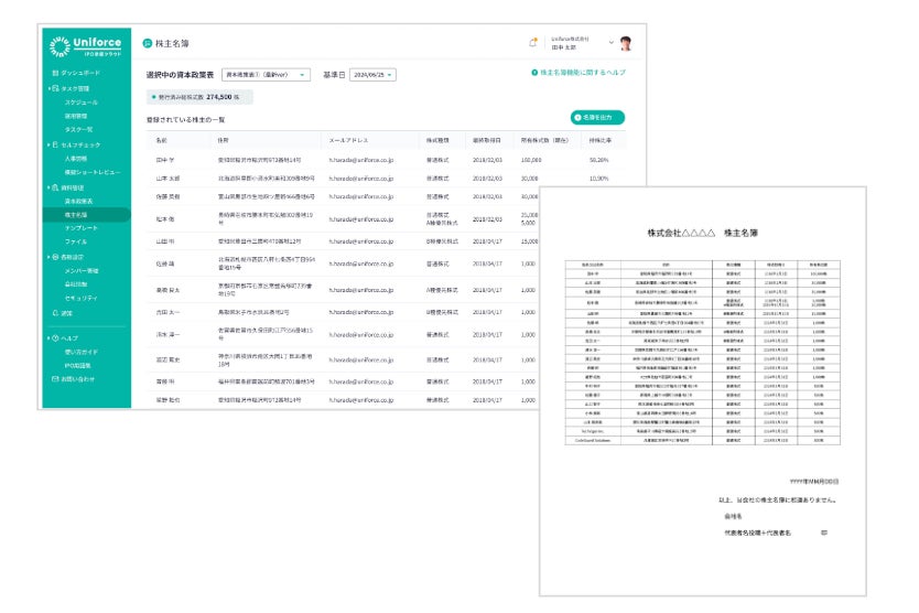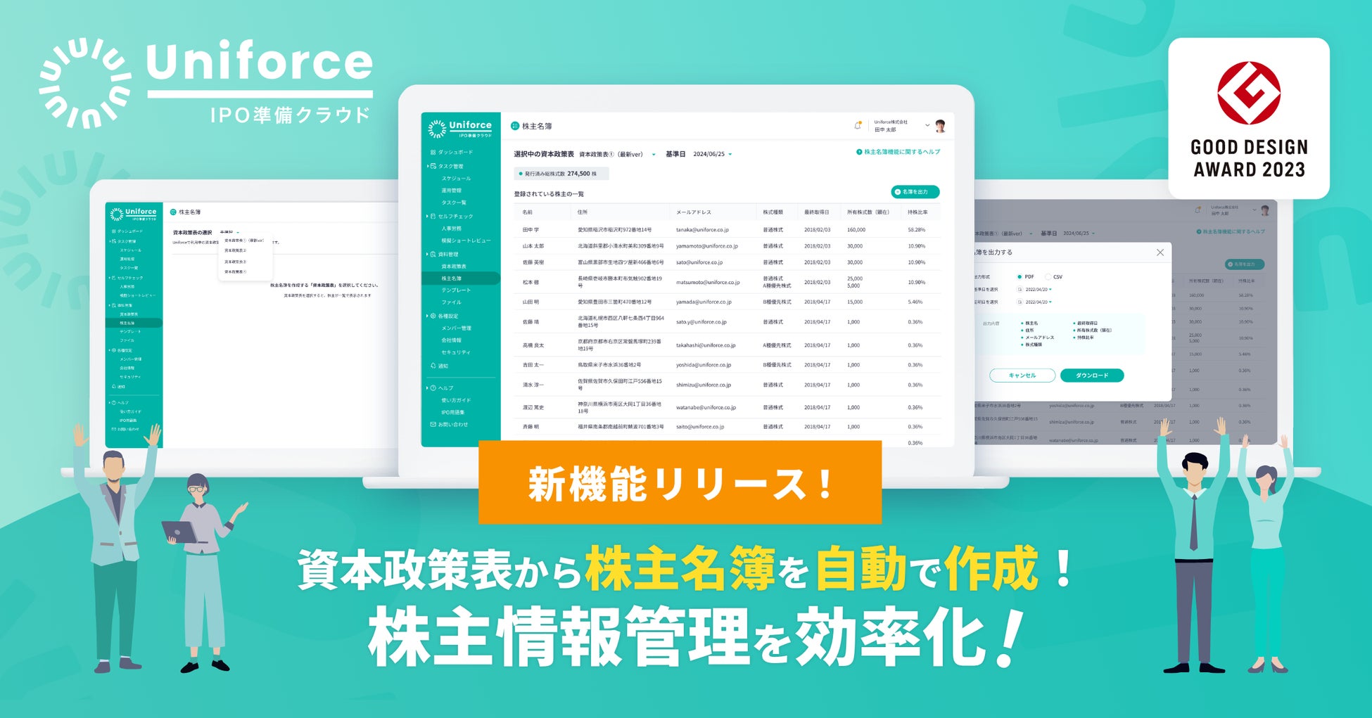 企業フェーズに合わせて持続的な成長の基盤を構築する「ガバナンスグロース」を企業ミッションに掲げるUniforce株式会社(代表取締役CEO:砂田 和也、以下「当社」)は、6月12日、当社が開発・運営する「IPO準備クラウド」内に、「株主名簿機能」をリリースしたことをお知らせします。
