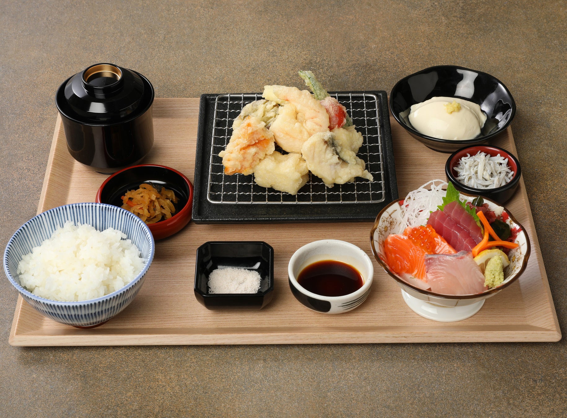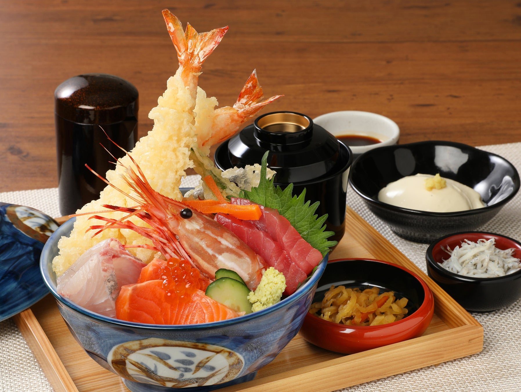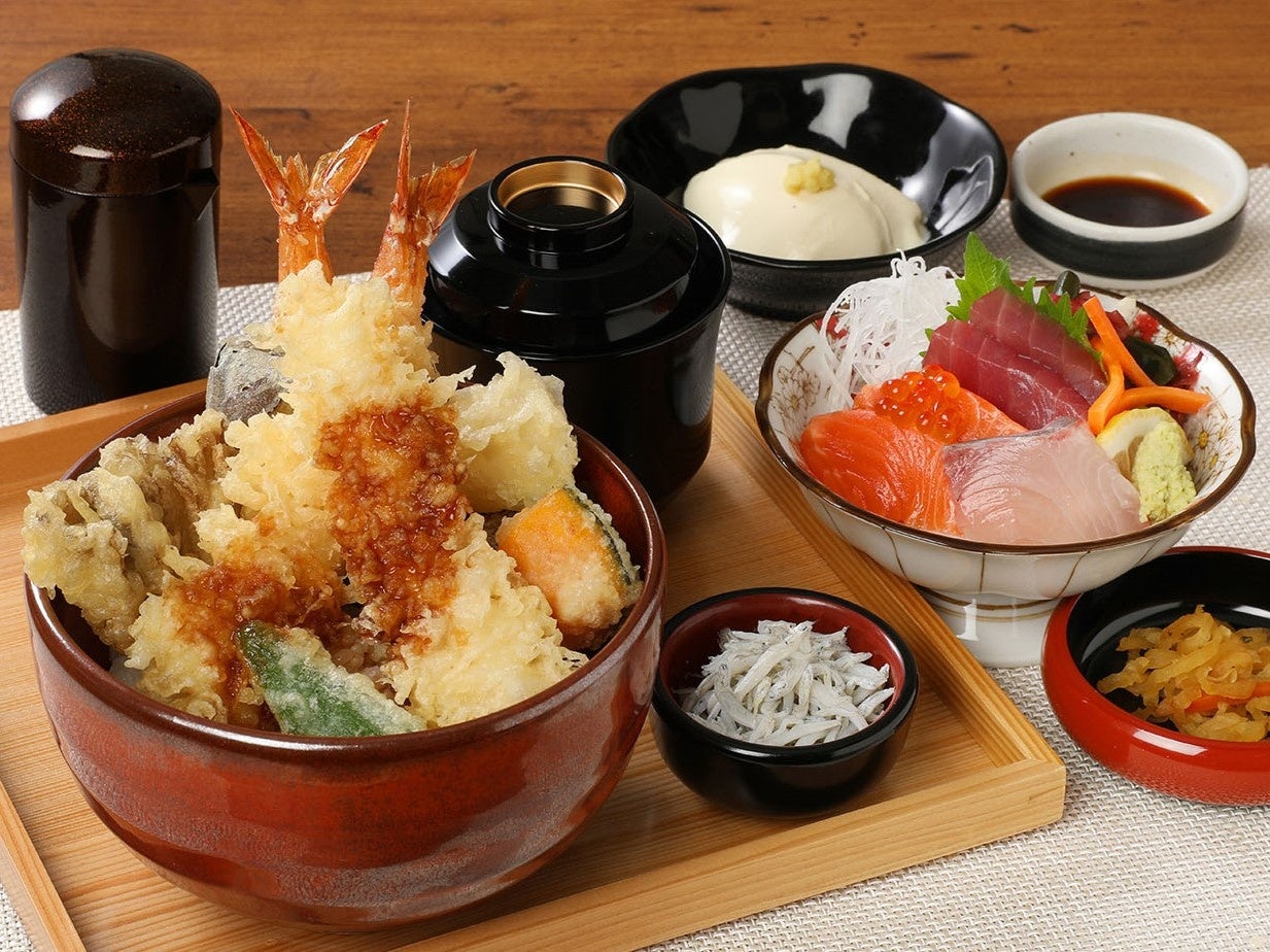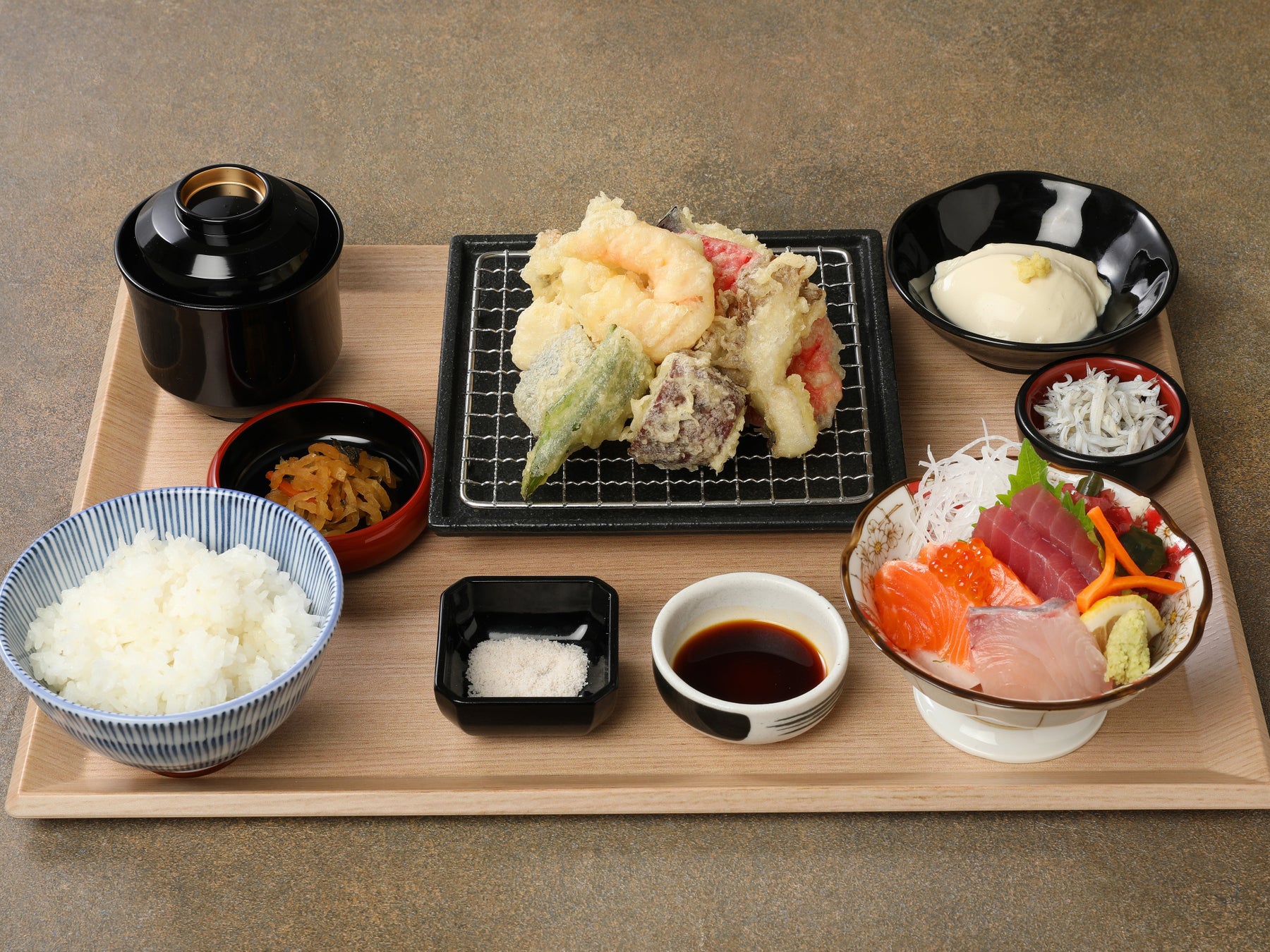 大阪木津市場から仕入れた食材等を天ぷらに仕立て、少量多品目を楽しめる「天丼メニュー」と「定食メニュー」をご用意。バラエティ豊かな風味と食感の天ぷらを、ご飯と共にお召し上がりいただけます。