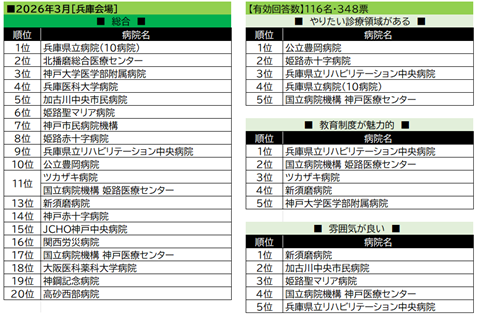 【兵庫会場】は2会場合算の結果としてリリース。全体としては国公立病院系が多くランクイン。総合トップは兵庫県立病院(10病院)。「教育制度が魅力的」でトップの兵庫県立リハビリテーション中央病院は、「やりたい診療領域」で3位、「雰囲気が良い」でも5位に登場。「雰囲気が良い」の首位は民間の新須磨病院が獲得した。