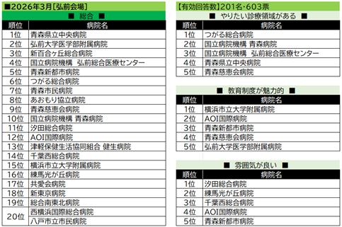 【弘前会場】のトップは青森県立中央病院。総合ランキングでは青森県の病院が名を連ねるなか、「教育制度が魅力的」、「雰囲気が良い」のジャンルでは、神奈川県の病院が複数見受けられた。