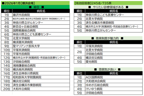 【横浜会場】では、国公立・大学病院等、多種多様な病院が各ジャンルでランクイン。「総合」トップは藤沢市民病院、「教育制度」では平塚共済病院、「雰囲気」ではAOI国際病院と民間病院も目立つ結果となった。