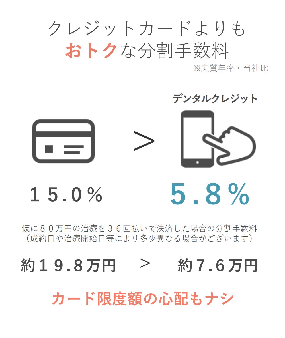 クレジットカードと違い「加盟店手数料0円」で歯科医院のコスト削減に繋がり、患者様の分割手数料もクレジットカードより断然おトク(※【図1】)なので、おすすめしやすいのが特徴です。