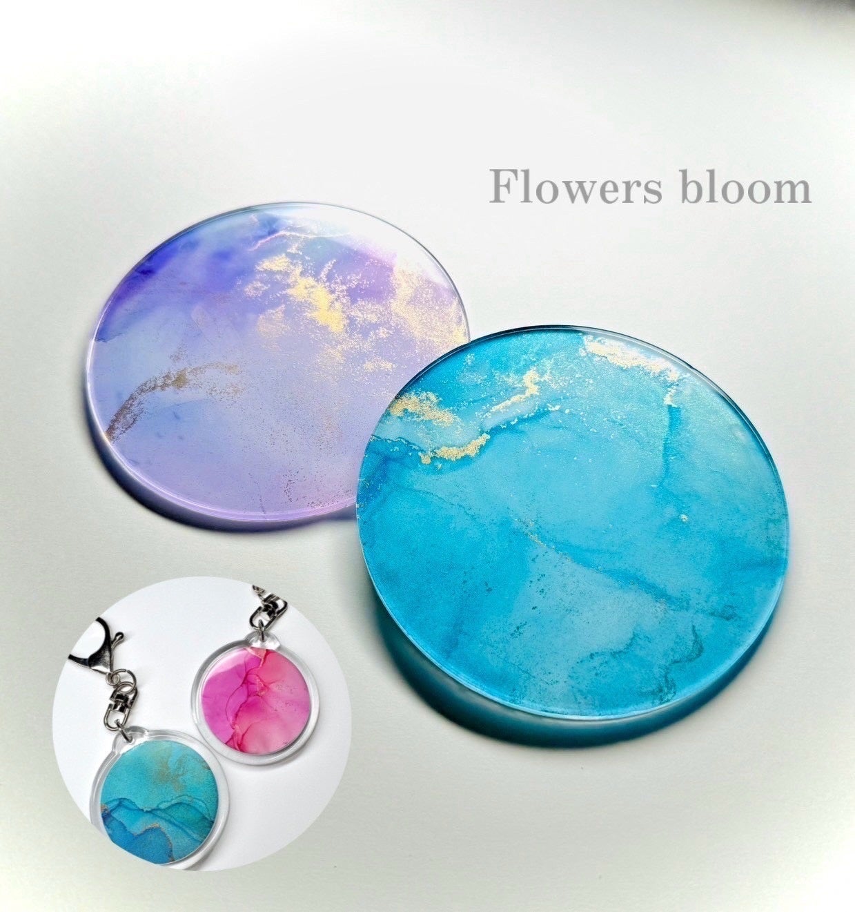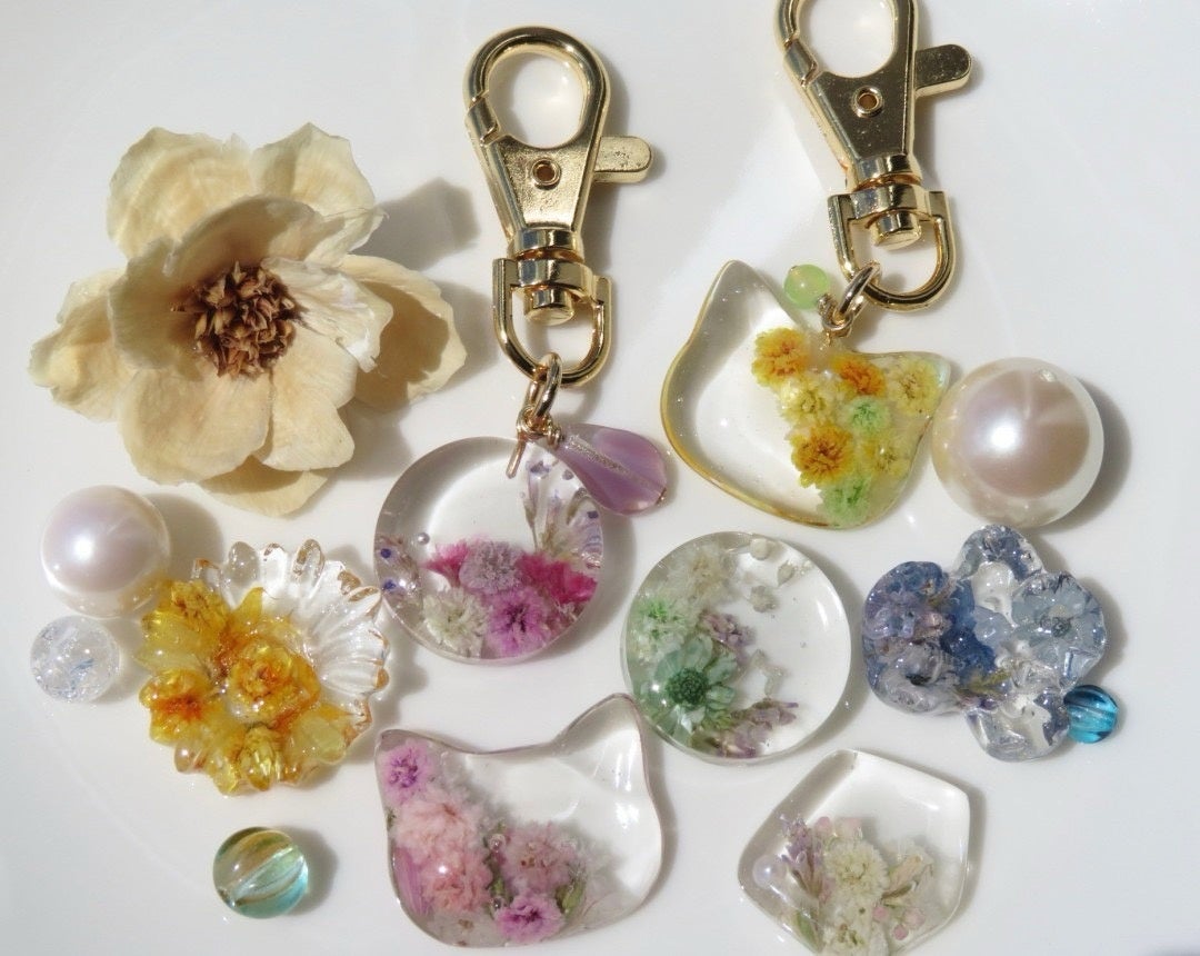 本物のお花を閉じ込めた世界に一つだけのレジンキーホルダーを作りませんか?お客様に選んで頂いたお花をお好みの型に入れ、レジンと呼ばれる樹脂でかためます。