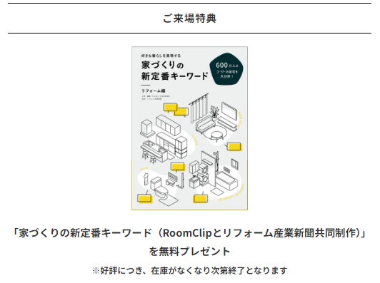 ・メーカーカタログ&施工事例テイストマップ無料プレゼント ・「家づくりの新定番キーワード(RoomClipとリフォーム産業新聞共同制作)」を無料プレゼント ※好評につき、在庫がなくなり次第終了となります |
