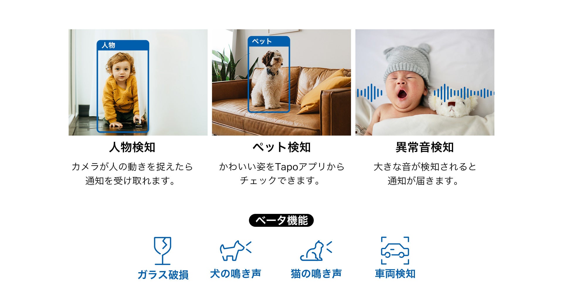 「Tapo C220」のスマートAIは、人物・ペットを賢く認識し、必要に応じてユーザーへお知らせします。物体だけでなく、赤ちゃんの大きな泣き声等の異常音も検知することが可能です。