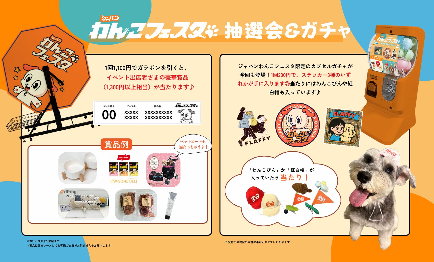会場には、ジャパンわんこフェスタ初企画となる「わんわん抽選会」と、前回好評だったイベント限定のカプセルガチャも登場します!「わんわん抽選会」は1回1,100円でガラポンを回すと、出店者さま提供の1,300円以上相当の豪華賞品が必ず当たるお得な企画。愛犬用おやつやケア用品など、嬉しいアイテムが盛りだくさん。また、会場限定カプセルガチャ(1回200円)では、3種類のオリジナルステッカーのほか、当たりには“わんこピン”や“紅白帽”などの特別アイテムが入っている場合も!