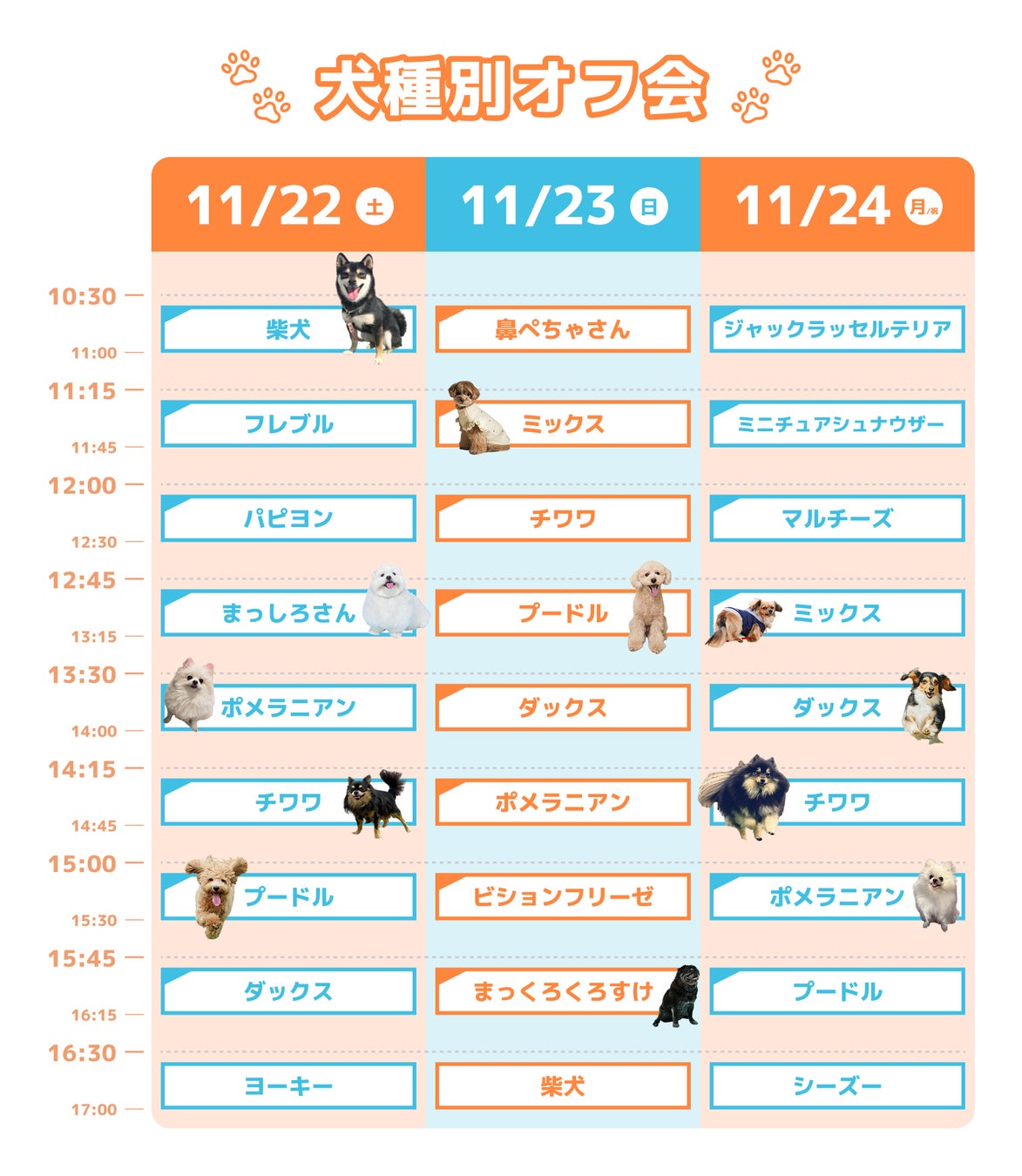 ステージコンテンツでは新たに『わんわん運動会』『わんわんサッカー部オフ会』など新企画も多数登場!また毎回大人気の犬種別オフ会も開催。ドッグラン内で記念撮影や情報交換ができ、名刺交換タイムも実施します。当日の開催時間に指定エリアへ集まるだけで参加でき、事前予約不要。愛犬との秋の一日を思いきり楽しめるラインアップとなっています。