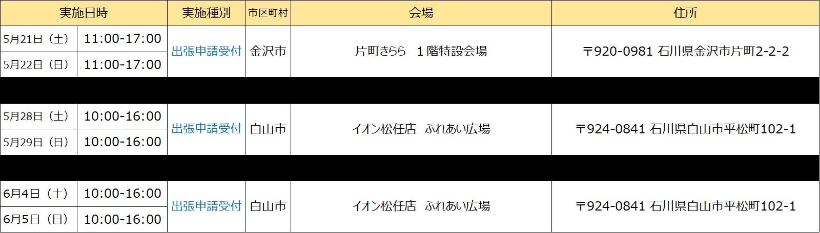 ※開催場所の調整状況や新型コロナウィルスの感染状況等により、「出張申請受付」及び「出張申請サポート」の開催を中止・延期、または実施内容が変更となる可能性がございます。