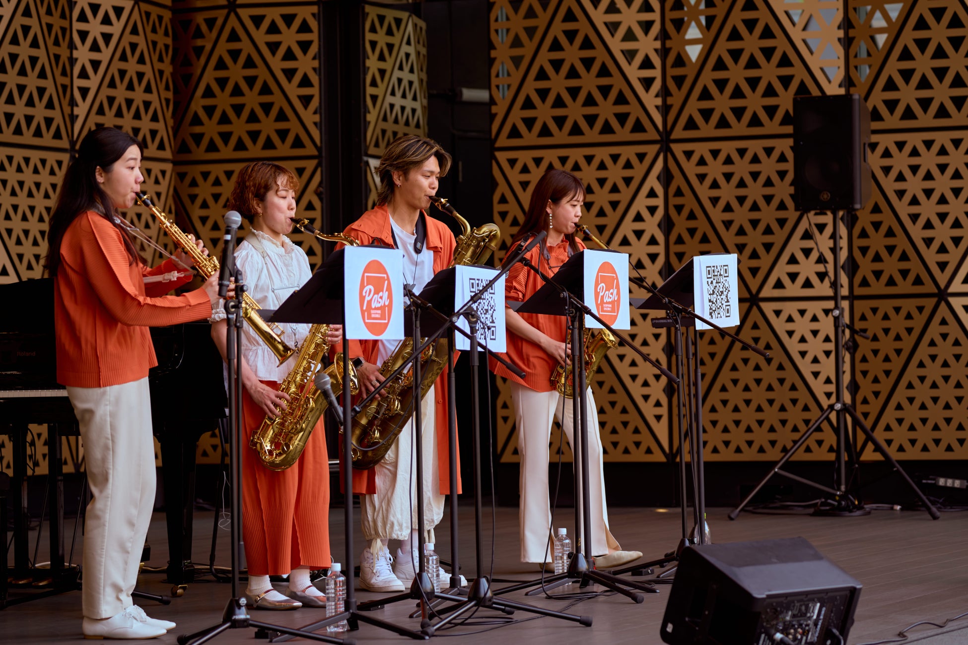 オープニングを飾ったのは尾上 桃可、川田 詩恵奈、齋尾 円佳、 井上 雄哉によるPash saxophone ensemble(サックスカルテット)。