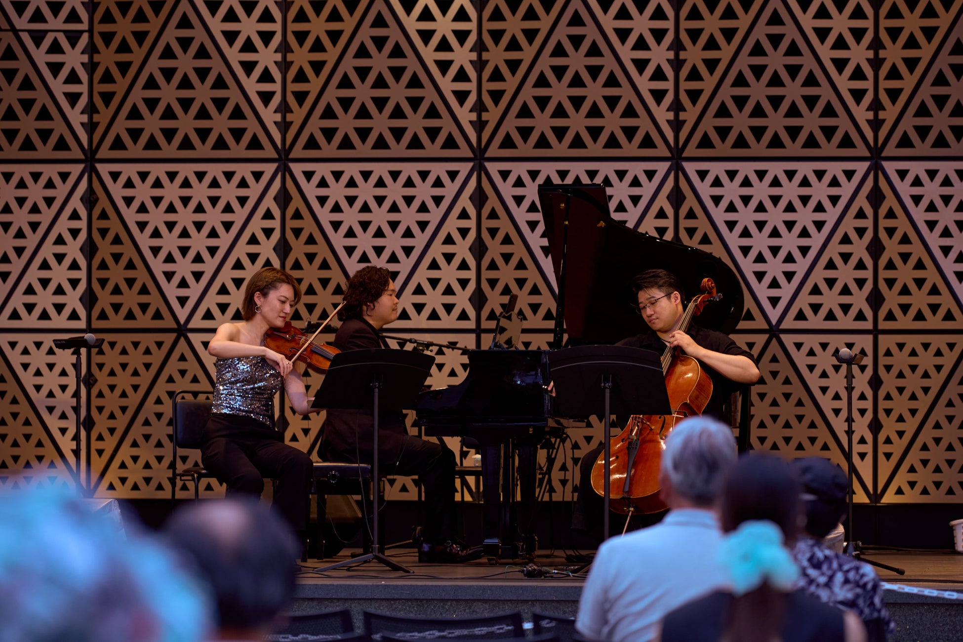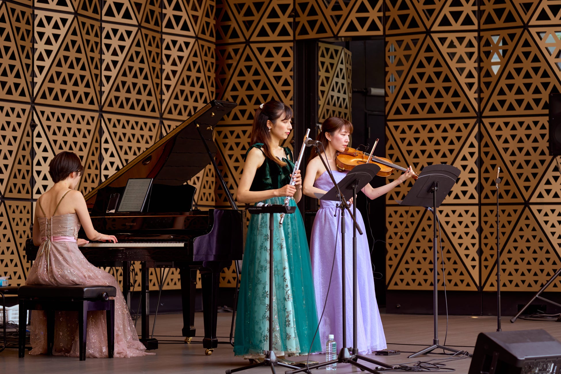 続いて登場したのは杉﨑沙耶(ピアノ)、益子友里(フルート)、石川可奈子(ヴィオラ)によるトリオ。ピアノを務める杉﨑沙耶は第2回JMSにも出演しており、今回はトリオで登場。1曲目に『ニュー・シネマ・パラダイス・メドレー』、2曲目にガーシュウィンの『アイ・ガット・リズム』を演奏した。ガーシュウィンはクラシックとジャズを融合させた作曲家であり、今回のテーマにぴったりと選曲した。終盤ではガーシュウィン作曲の『ラプソディ・イン・ブルー』と『情熱大陸』を演奏し会場を魅了した。