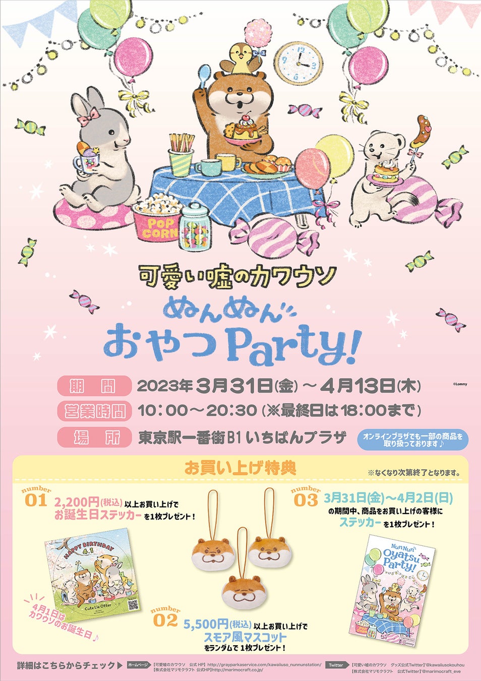 最新情報は「可愛い嘘のカワウソ ぬんぬんおやつParty!@東京駅 特設ページ」もしくは「マリモクラフト イベント用Twitterアカウント」をご確認ください。