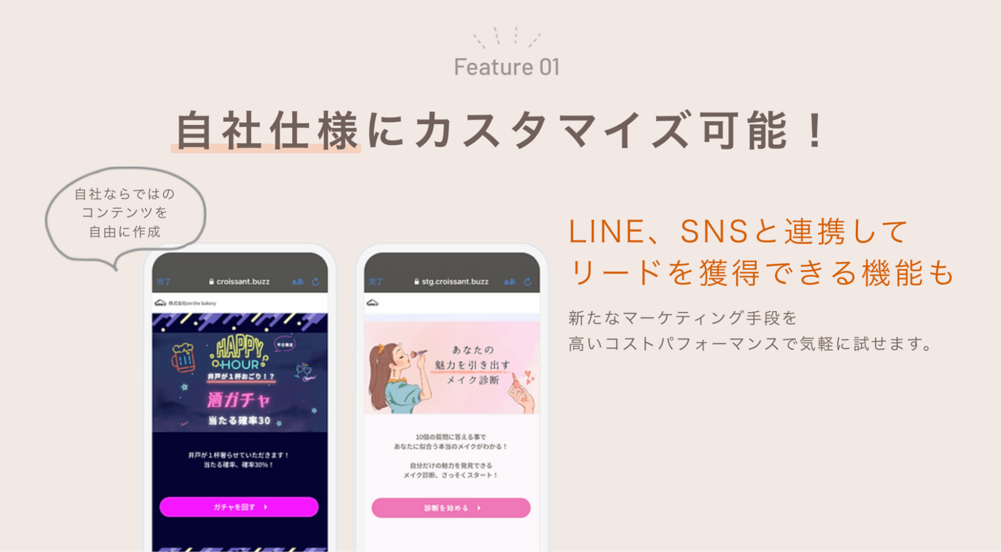 クロワッサンは、企業向けにオンラインガチャ・診断コンテンツを作成できるツールです。