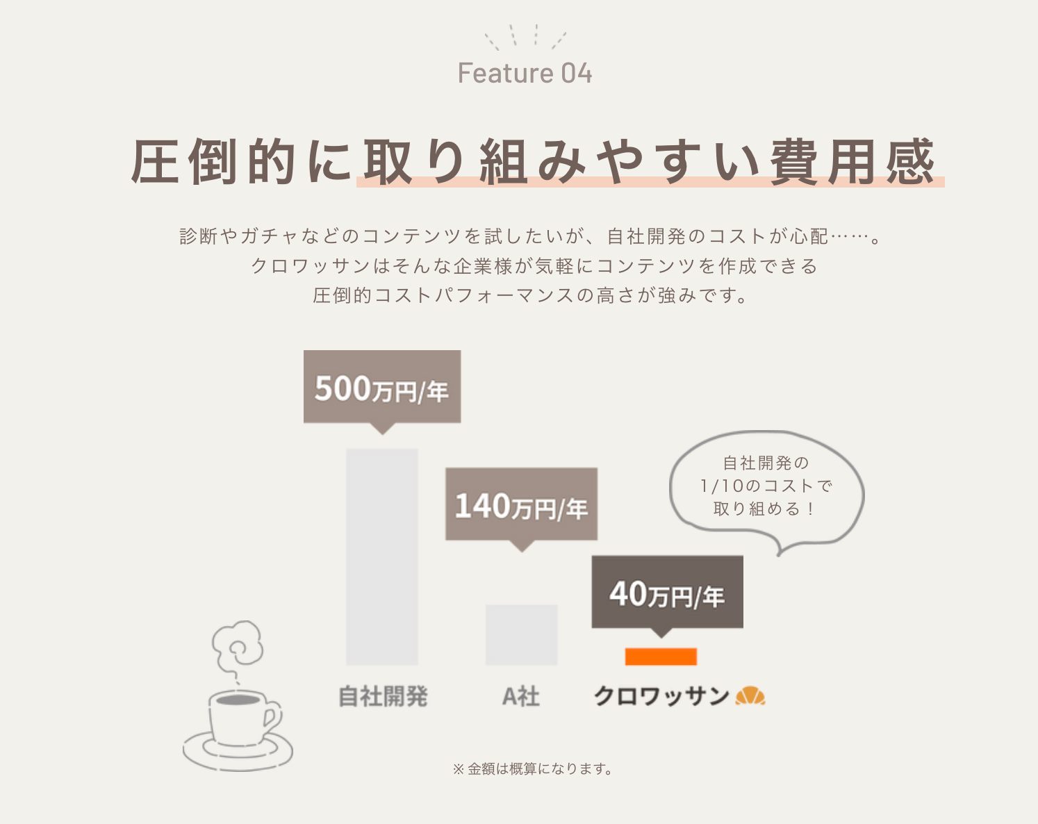 診断やガチャに取り組みたくても、開発コストが心配で始められないという企業様も多いものです。