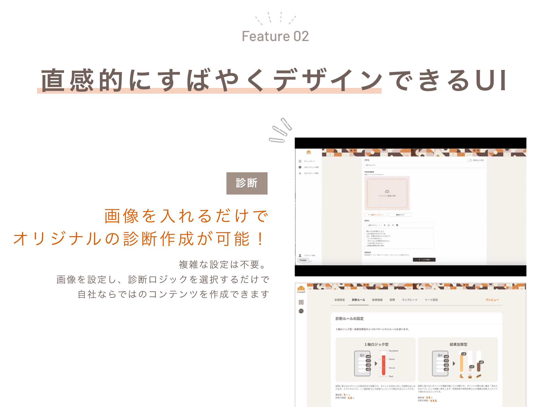 「診断ロジックの選択」を行い、設問・回答の内容をフォーマットに沿って決めるだけで複雑な設定をすることなく、自社ならではのコンテンツが完成します。