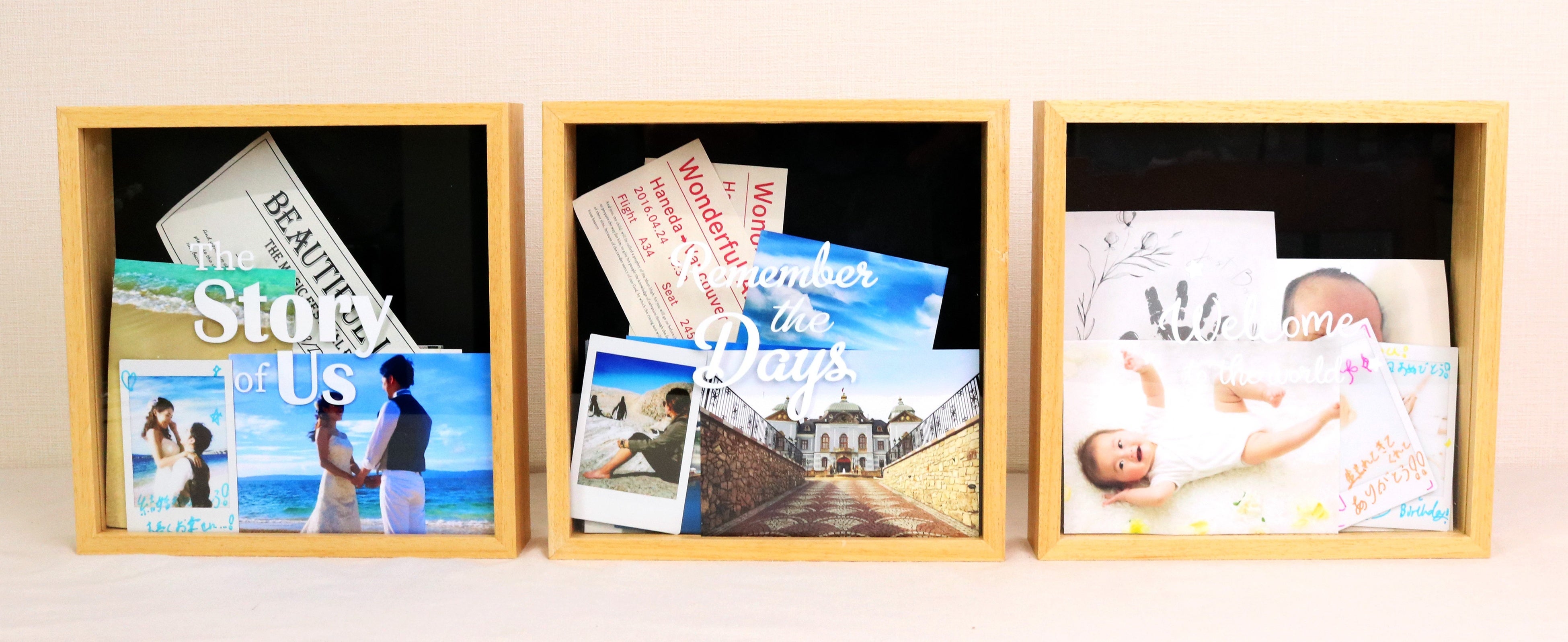 ・ 写真やチケットなどを飾りながら保管できる箱型の収納用品