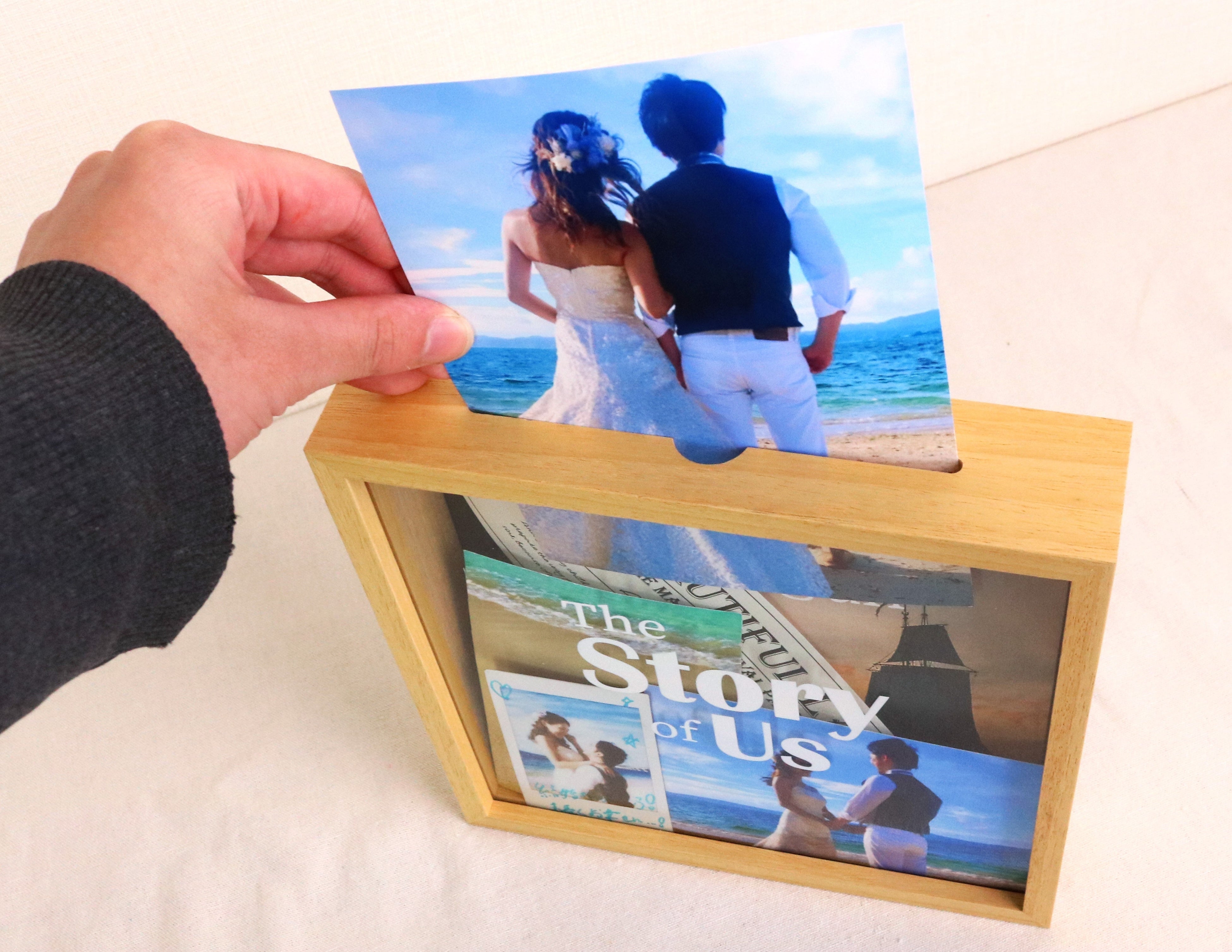 「メモリアルポスト」は写真やチケットなどを飾りながら保管できる箱型の収納用品です。本体上部の穴(縦5mm×横129mm)から写真やチケットをポストに投函するように入れるだけで思い出をまとめることができます。表面は透明感のあるガラス張り。入れた写真等はポスト仕様ならではのランダムな重なり具合でおしゃれに飾れ、インテリアとしても楽しめます。背面は開けることが出来るので写真を入れ替えることも可能です。